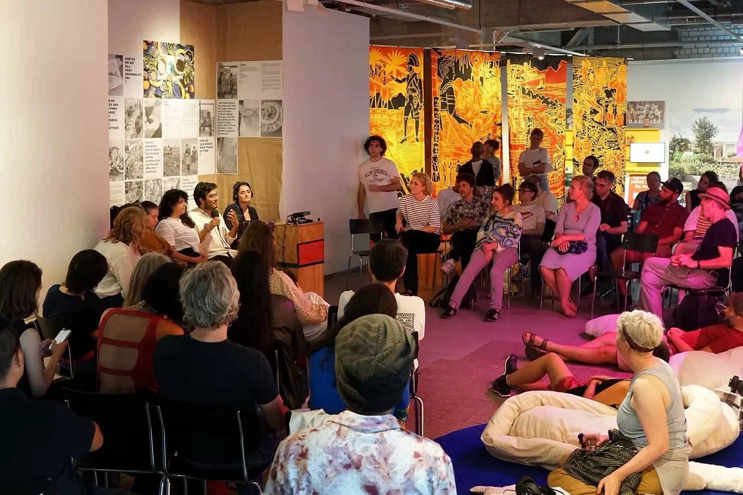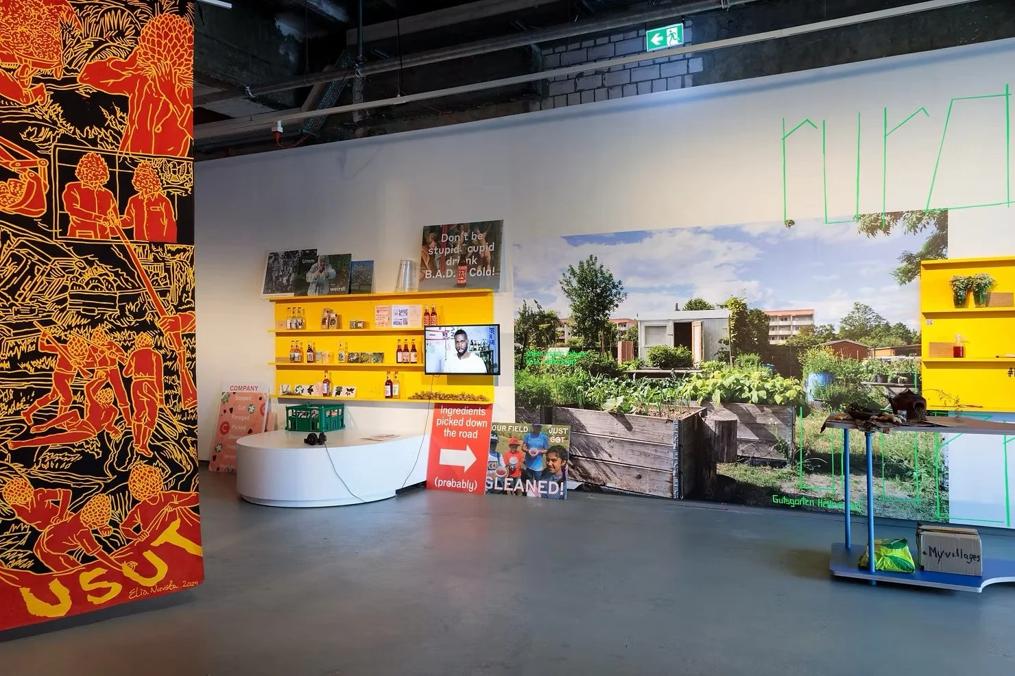 Panel from Elia Nurvista’s ‘The Route’ (left) and MyVillages / Company Drinks (centre), Municipal Kitchens, nGbK, July 2024 ©Benjamin Renter