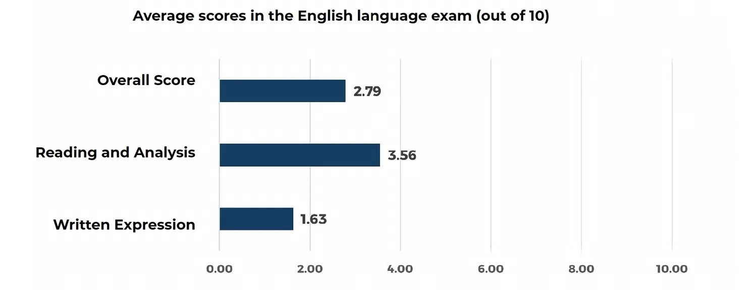 The English language exam results were also concerning, with students demonstrating significant gaps in their reading and writing abilities and only a 13% passing rate. The average student’s score in the English language exam was 2.79 out of 10. The lowest scores were observed in the written expression section, with an average of 1.63 out of 10. Meanwhile, the average score in reading and analysis questions was 2.71 out of 10.