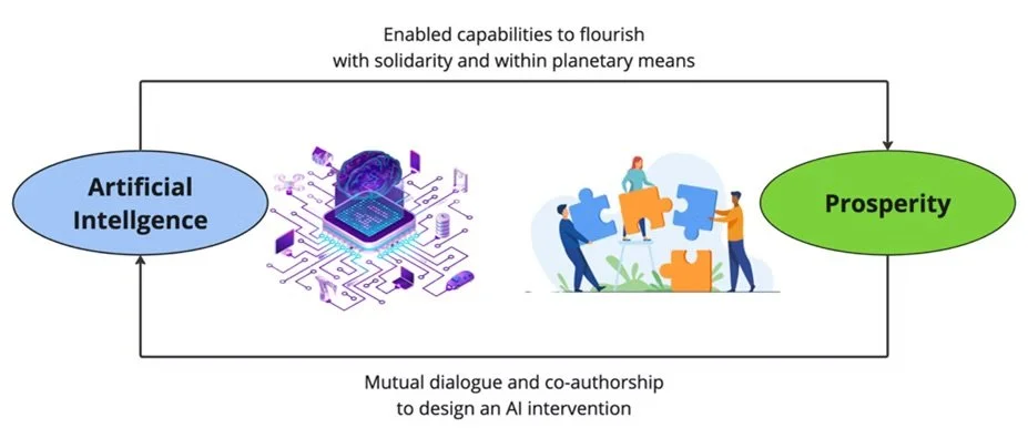 Conversations around “AI for Good” often focus on how AI can fix societal challenges. Given our focus on prosperity, it might seem logical to call “AI for Prosperity.” Yet, framing AI “for” something risks implying a one-way influence where AI merely acts upon prosperity. In reality, prosperity thinking can and should shape AI development just as much as AI can elevate our collective visions of flourishing (Figure 1).