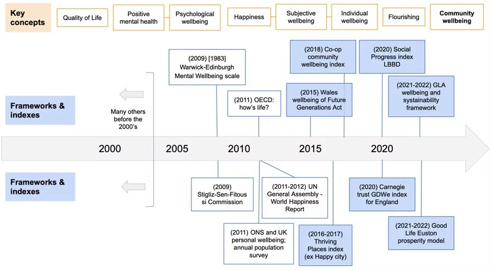 As per our review, the wellbeing and the UK community wellbeing measurement landscape can be very succinctly summarised in a timeline: